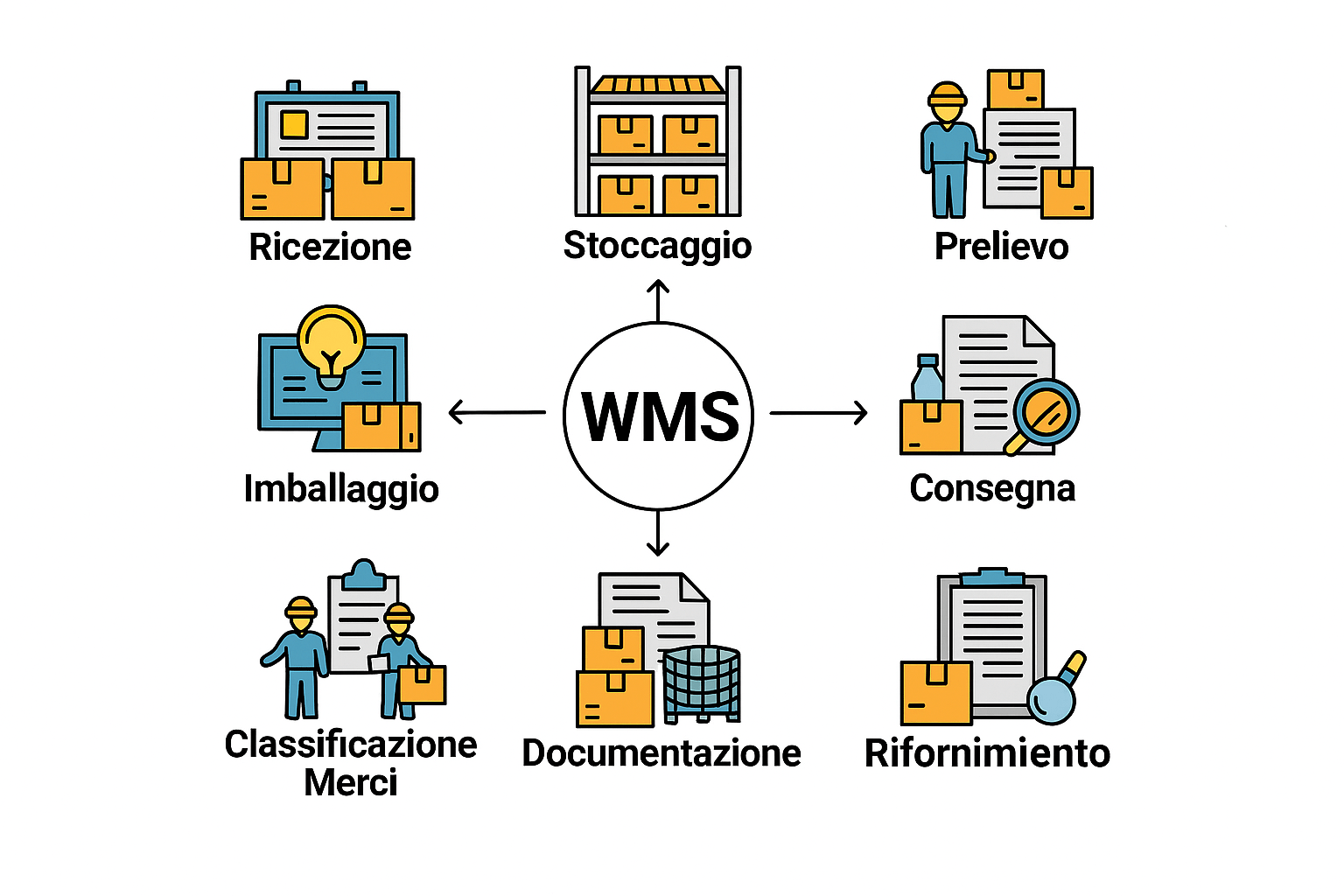 Il WMS traccia lo stock in tempo reale con codici a barre, RFID e sensori. Migliora la visibilità, la tracciabilità e consente strategie just-in-time più accurate.